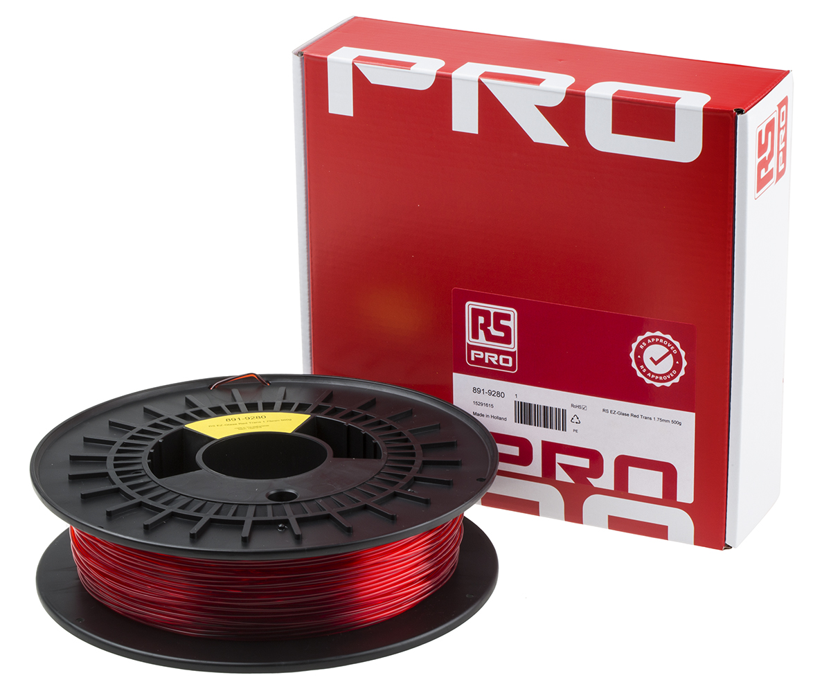 This is 1.75mm Translucent Red PET-G 3D Printer Filament 500g manufactured by RS Pro. The manufacturer part number is 891-9280. Its diameter is 1.75mm. The typical product's weight is 500g.