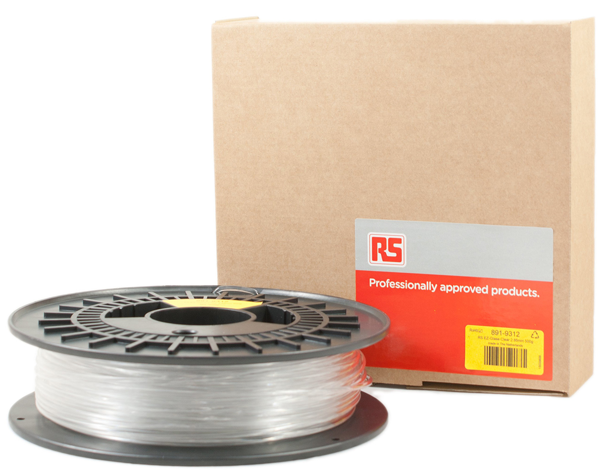 This is 2.85mm Clear PET-G 3D Printer Filament 500g manufactured by RS Pro. The manufacturer part number is 891-9312. Its diameter is 2.85mm. The typical product's weight is 500g.