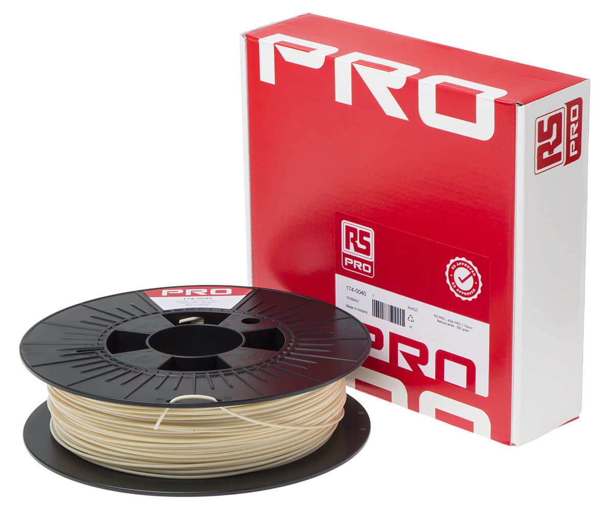 This is 1.75mm White 3D Printer Filament 500g manufactured by RS Pro. The manufacturer part number is 174-0040. Its diameter is 1.75mm. The typical product's weight is 500g.