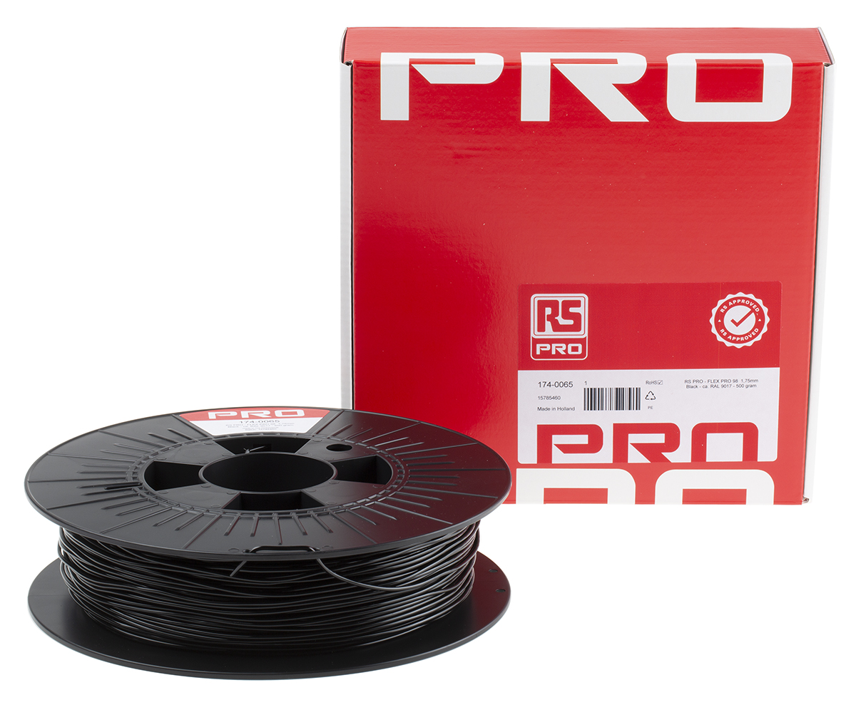 This is 1.75mm Black 3D Printer Filament 500g manufactured by RS Pro. The manufacturer part number is 174-0065. Its diameter is 1.75mm. The typical product's weight is 500g.