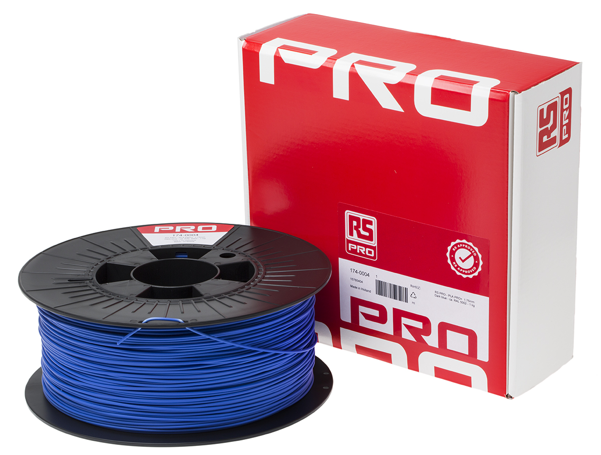 This is 1.75mm Blue PLA 3D Printer Filament 1kg manufactured by RS Pro. The manufacturer part number is 174-0004. Its diameter is 1.75mm. The typical product's weight is 1kg.