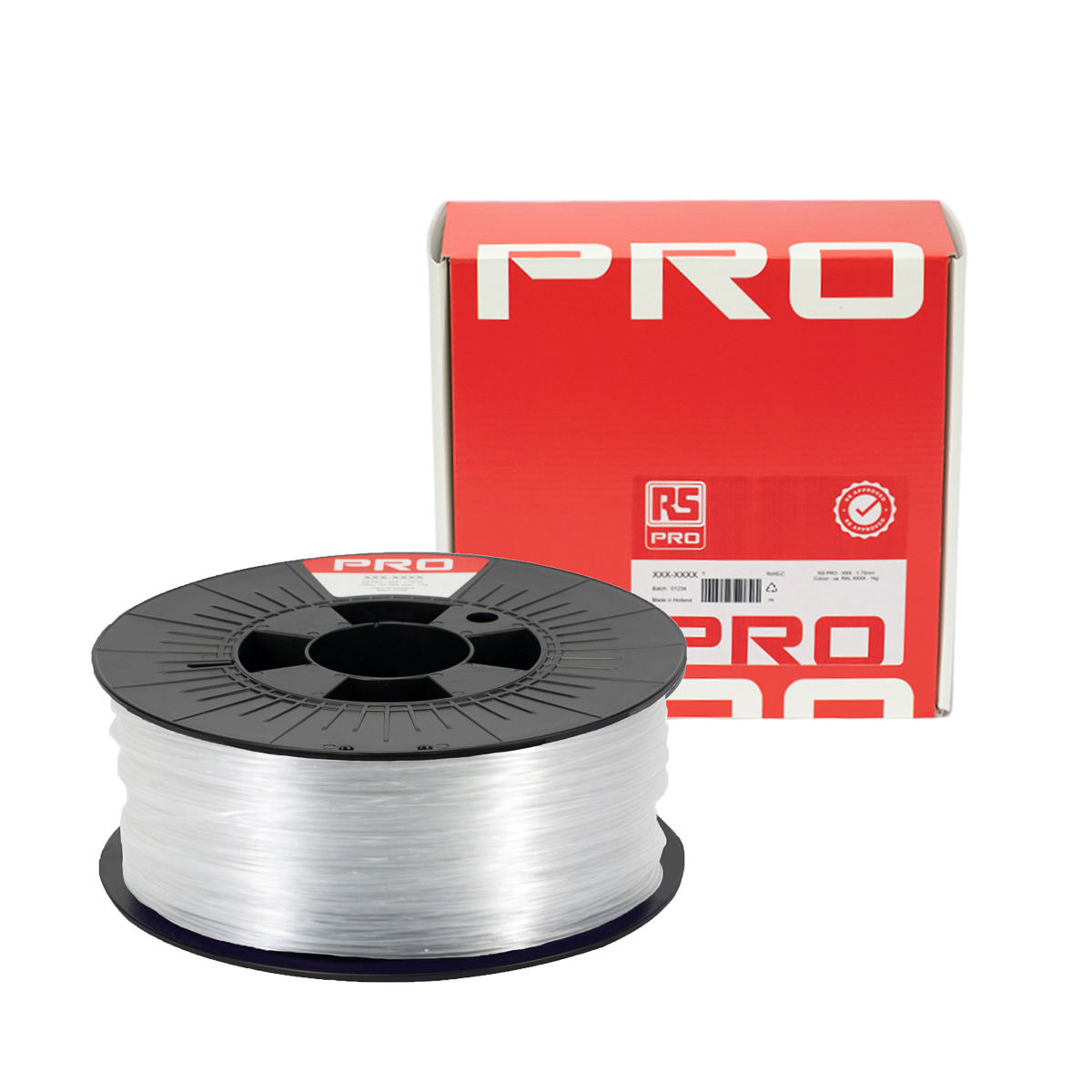 This is 1.75mm Clear PET-G 3D Printer Filament 1kg manufactured by RS PRO. The manufacturer part number is 190-1955. Its diameter is 1.75mm. The typical product's weight is 1kg.