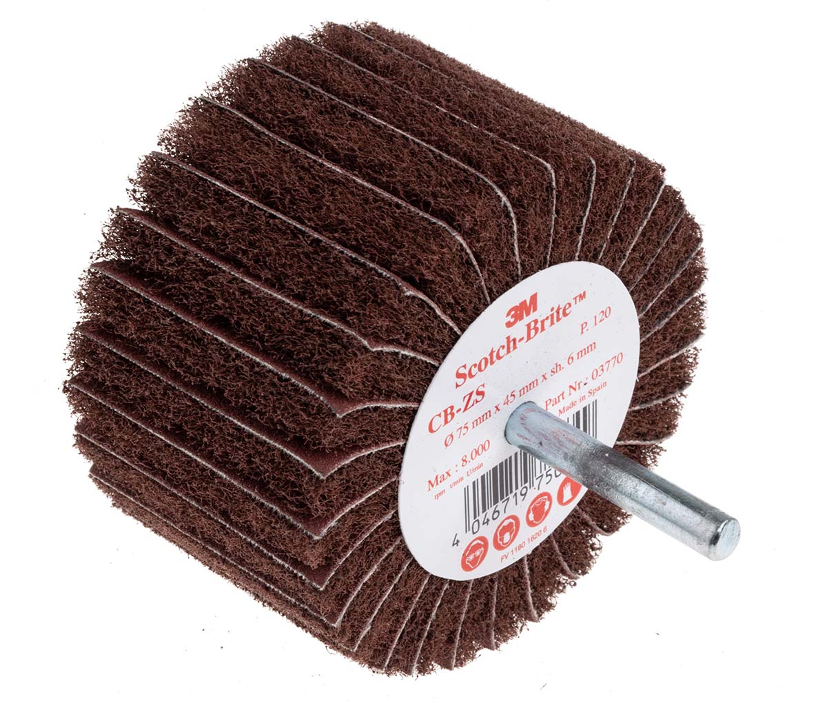 This is Aluminium Oxide Flap Wheel P120 Grit 75mm x 45mm x 6mm manufactured by 3M. The manufacturer part number is 3M450 COMBI 75X45X6 P120. Its diameter is 75mm.
