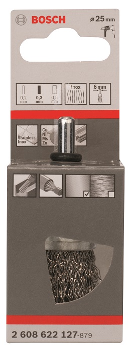 This is Stainless Steel Cup Abrasive Brush 25mm Diameter manufactured by Bosch. The manufacturer part number is 2608622127. Its diameter is 25mm.