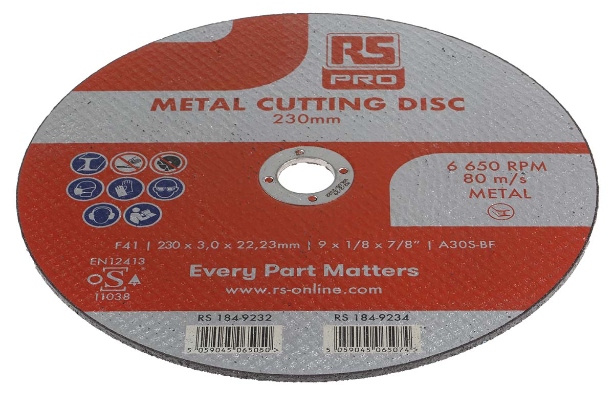This is 230mm x 3.0mm x 22mm Metal Cutting Disc manufactured by RS PRO. The manufacturer part number is 184-9232. It is 3mm thick. It is manufactured from rugged aluminium oxide abrasive materials.