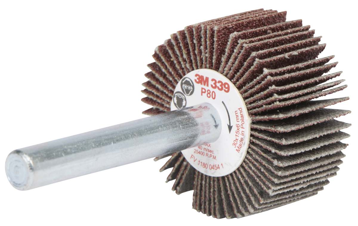This is Aluminium Oxide Flap Wheel P80 Grit 30mm x 15mm x 6mm manufactured by 3M. The manufacturer part number is FC110075536. Its diameter is 30mm. It is manufactured from rugged aluminium oxide abrasive materials.