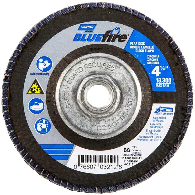 This is manufactured by Norton. The manufacturer part number is 07660703212. Its diameter is 4.50" (114.30mm). It is shipped in bulk. It has a classic blue colour. Abrasive Grade Info: coarse. The product is widely employed in general purpose. It is manufactured from rugged zirconia alumina abrasive materials. The product is designated with the ear99 code number