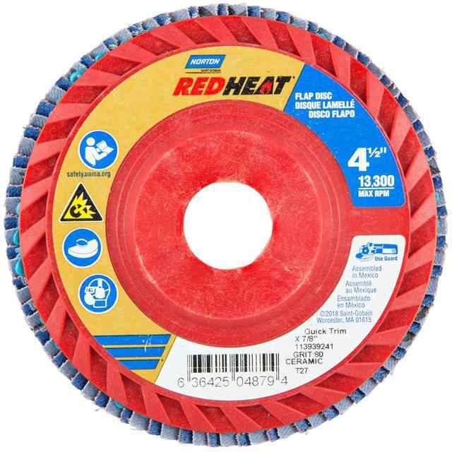 This is manufactured by Norton. The manufacturer part number is 63642504879. Its diameter is 4.50" (114.30mm). It is shipped in bulk. It has a classic red colour. While its abrasive grit is p80. Abrasive Grade Info: coarse. The product is widely employed in general purpose. It is manufactured from rugged ceramic alumina abrasive materials. The product is designated with the ear99 code number