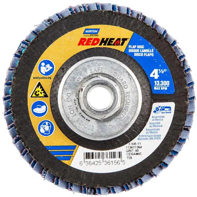 This is manufactured by Norton. The manufacturer part number is 63642536156. Its diameter is 4.50" (114.30mm). It is shipped in bulk. It has a classic red colour. While its abrasive grit is p40. Abrasive Grade Info: extra coarse. The product is widely employed in general purpose. It is manufactured from rugged ceramic alumina abrasive materials. The product is designated with the ear99 code number