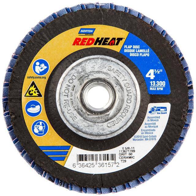 This is manufactured by Norton. The manufacturer part number is 63642536157. Its diameter is 4.50" (114.30mm). It is shipped in bulk. It has a classic red colour. While its abrasive grit is p60. Abrasive Grade Info: coarse. The product is widely employed in general purpose. It is manufactured from rugged ceramic alumina abrasive materials. The product is designated with the ear99 code number