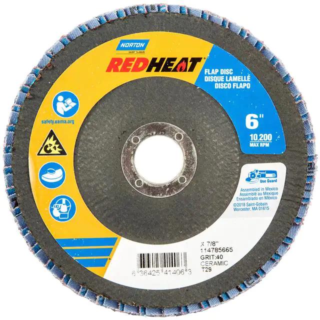 This is manufactured by Norton. The manufacturer part number is 63642541406. Its diameter is 6.00" (152.40mm). It is shipped in bulk. It has a classic red colour. While its abrasive grit is p40. Abrasive Grade Info: extra coarse. The product is widely employed in general purpose. It is manufactured from rugged ceramic alumina abrasive materials. The product is designated with the ear99 code number