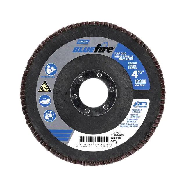 This is manufactured by Norton. The manufacturer part number is 66254461164. Its diameter is 4.50" (114.30mm). It is shipped in bulk. It has a classic blue colour. While its abrasive grit is p80. Abrasive Grade Info: coarse. The product is widely employed in general purpose. It is manufactured from rugged zirconia alumina abrasive materials. The product is designated with the ear99 code number