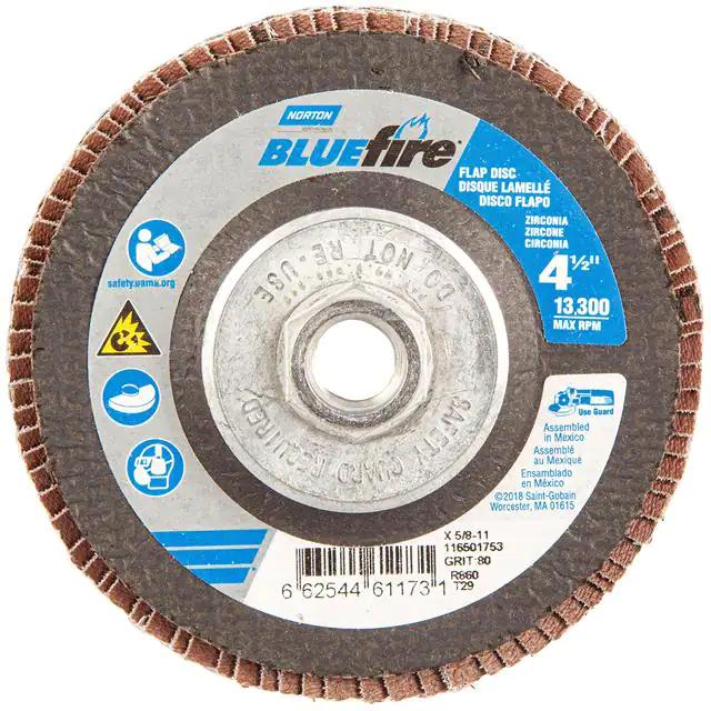 This is manufactured by Norton. The manufacturer part number is 66254461173. Its diameter is 4.50" (114.30mm). It is shipped in bulk. It has a classic blue colour. While its abrasive grit is p80. Abrasive Grade Info: coarse. The product is widely employed in general purpose. It is manufactured from rugged zirconia alumina abrasive materials. The product is designated with the ear99 code number