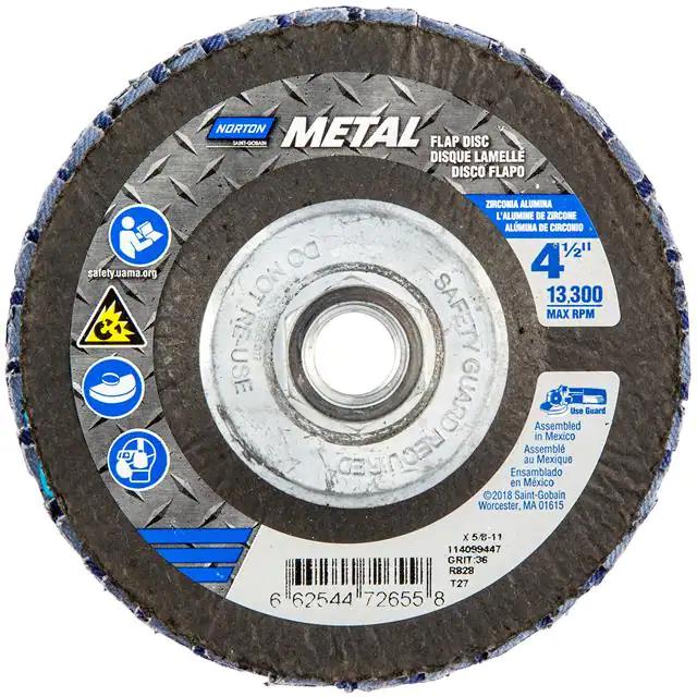 This is manufactured by Norton. The manufacturer part number is 66254472655. Its diameter is 4.50" (114.30mm). It is shipped in bulk. It has a classic blue colour. While its abrasive grit is p36. Abrasive Grade Info: extra coarse. The product is widely employed in general purpose. It is manufactured from rugged zirconia alumina abrasive materials. The product is designated with the ear99 code number