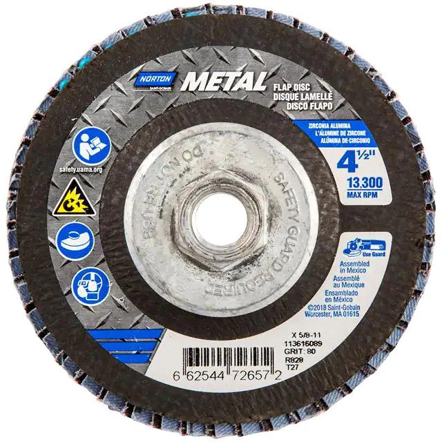 This is manufactured by Norton. The manufacturer part number is 66254472657. Its diameter is 4.50" (114.30mm). It is shipped in bulk. It has a classic blue colour. While its abrasive grit is 80. Abrasive Grade Info: coarse. The product is widely employed in general purpose. It is manufactured from rugged zirconia alumina abrasive materials. The product is designated with the ear99 code number