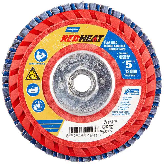 This is manufactured by Norton. The manufacturer part number is 66254491941. Its diameter is 5.00" (127.00mm). It is shipped in bulk. It has a classic red colour. While its abrasive grit is p40. Abrasive Grade Info: extra coarse. The product is widely employed in general purpose. It is manufactured from rugged ceramic alumina abrasive materials. The product is designated with the ear99 code number