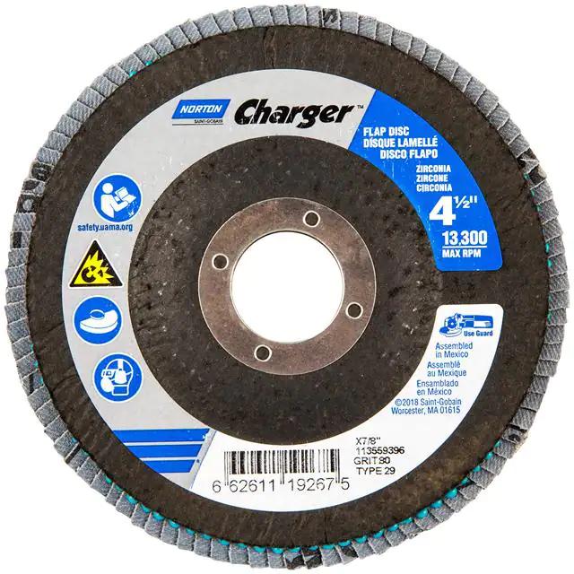 This is manufactured by Norton. The manufacturer part number is 66261119267. Its diameter is 4.50" (114.30mm). It is shipped in bulk. It has a classic blue colour. While its abrasive grit is p80. Abrasive Grade Info: coarse. The product is widely employed in general purpose. It is manufactured from rugged zirconia alumina abrasive materials. The product is designated with the ear99 code number