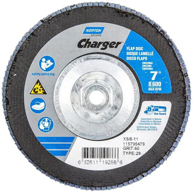 This is manufactured by Norton. The manufacturer part number is 66261119286. Its diameter is 7.00" (177.80mm). It is shipped in bulk. It has a classic blue colour. While its abrasive grit is p60. Abrasive Grade Info: coarse. The product is widely employed in general purpose. It is manufactured from rugged zirconia alumina abrasive materials. The product is designated with the ear99 code number