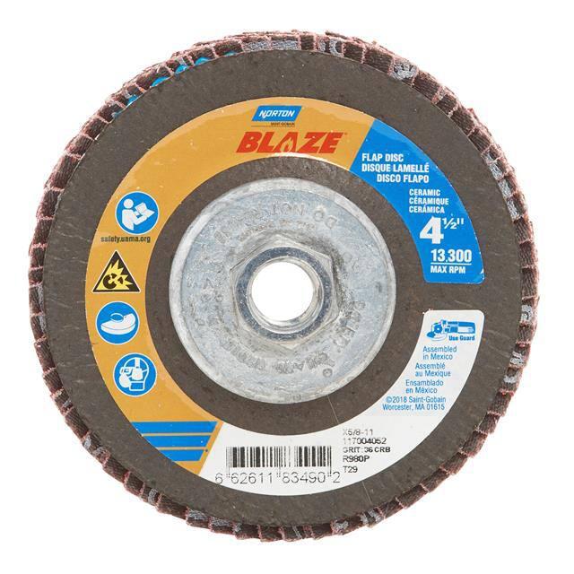 This is manufactured by Norton. The manufacturer part number is 66261183490. Its diameter is 4.50" (114.30mm). It is shipped in bulk. It has a classic orange colour. While its abrasive grit is 36. Abrasive Grade Info: extra coarse. The product is widely employed in general purpose. It is manufactured from rugged ceramic alumina abrasive materials. The product is designated with the ear99 code number