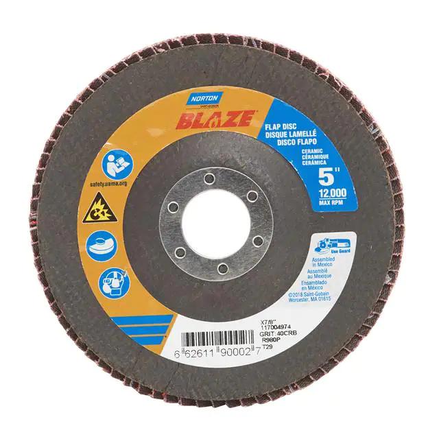 This is manufactured by Norton. The manufacturer part number is 66261190002. Its diameter is 5.00" (127.00mm). It is shipped in bulk. It has a classic orange colour. While its abrasive grit is 40. Abrasive Grade Info: extra coarse. The product is widely employed in general purpose. It is manufactured from rugged ceramic alumina abrasive materials. The product is designated with the ear99 code number
