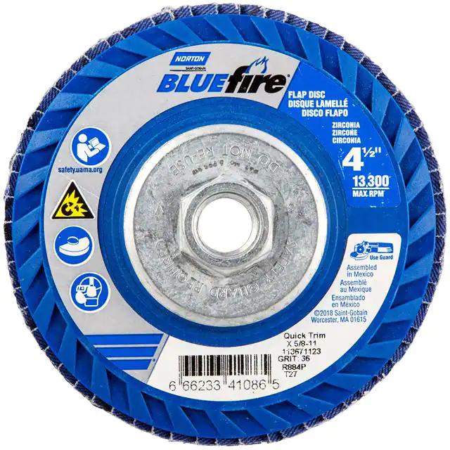 This is manufactured by Norton. The manufacturer part number is 66623341086. Its diameter is 4.50" (114.30mm). It is shipped in bulk. It has a classic blue colour. While its abrasive grit is p36. Abrasive Grade Info: extra coarse. The product is widely employed in general purpose. It is manufactured from rugged zirconia alumina abrasive materials. The product is designated with the ear99 code number
