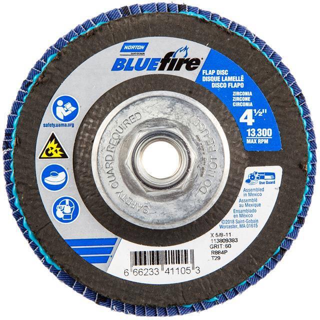 This is manufactured by Norton. The manufacturer part number is 66623341105. Its diameter is 4.50" (114.30mm). It is shipped in bulk. It has a classic blue colour. While its abrasive grit is p60. Abrasive Grade Info: coarse. The product is widely employed in general purpose. It is manufactured from rugged zirconia alumina abrasive materials. The product is designated with the ear99 code number