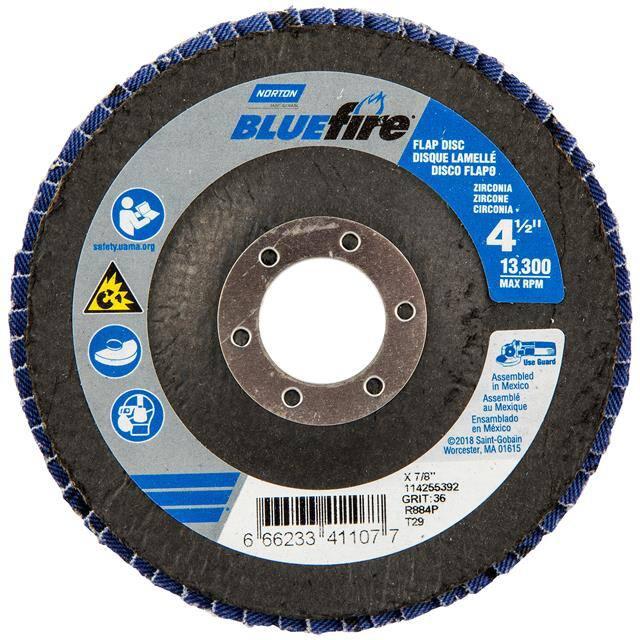 This is manufactured by Norton. The manufacturer part number is 66623341107. Its diameter is 4.50" (114.30mm). It is shipped in bulk. It has a classic blue colour. While its abrasive grit is p36. Abrasive Grade Info: extra coarse. The product is widely employed in general purpose. It is manufactured from rugged zirconia alumina abrasive materials. The product is designated with the ear99 code number