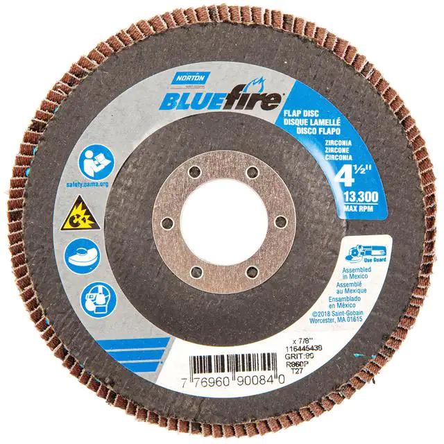 This is manufactured by Norton. The manufacturer part number is 77696090084. Its diameter is 4.50" (114.30mm). It is shipped in bulk. It has a classic blue colour. While its abrasive grit is p80. Abrasive Grade Info: coarse. The product is widely employed in general purpose. It is manufactured from rugged zirconia alumina abrasive materials. The product is designated with the ear99 code number