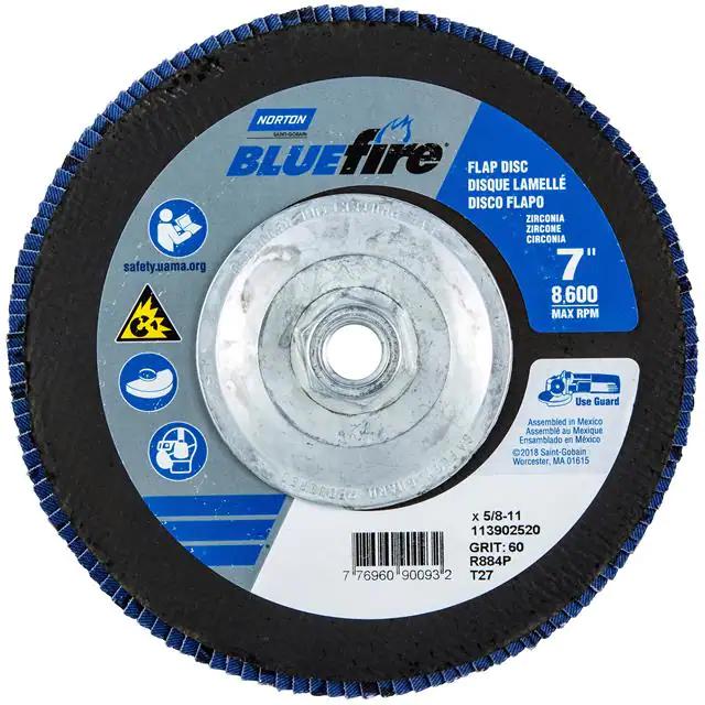 This is manufactured by Norton. The manufacturer part number is 77696090093. Its diameter is 7.00" (177.80mm). It is shipped in bulk. It has a classic blue colour. While its abrasive grit is p60. Abrasive Grade Info: coarse. The product is widely employed in general purpose. It is manufactured from rugged zirconia alumina abrasive materials. The product is designated with the ear99 code number