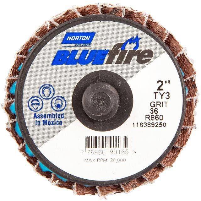 This is manufactured by Norton. The manufacturer part number is 77696090165. Its diameter is 2.00" (50.80mm). It is shipped in bulk. It has a classic blue colour. While its abrasive grit is p36. Abrasive Grade Info: extra coarse. The product is widely employed in general purpose. It is manufactured from rugged zirconia alumina abrasive materials. The product is designated with the ear99 code number