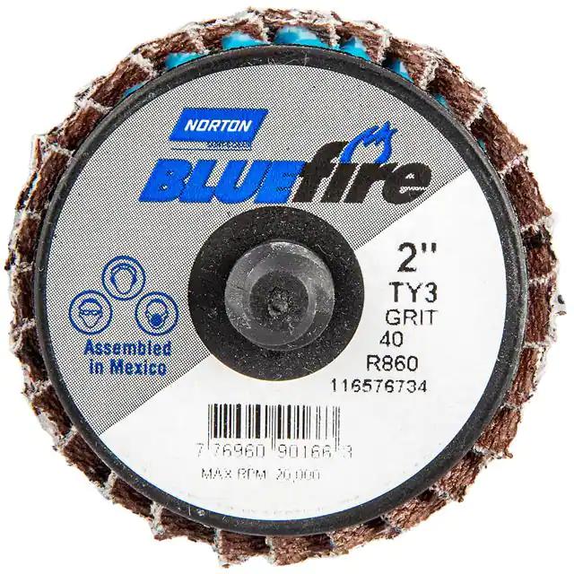 This is manufactured by Norton. The manufacturer part number is 77696090166. Its diameter is 2.00" (50.80mm). It is shipped in bulk. It has a classic blue colour. While its abrasive grit is p40. Abrasive Grade Info: extra coarse. The product is widely employed in general purpose. It is manufactured from rugged zirconia alumina abrasive materials. The product is designated with the ear99 code number