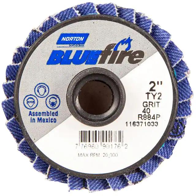 This is manufactured by Norton. The manufacturer part number is 77696090176. Its diameter is 2.00" (50.80mm). It is shipped in bulk. It has a classic blue colour. While its abrasive grit is p40. Abrasive Grade Info: extra coarse. The product is widely employed in general purpose. It is manufactured from rugged zirconia alumina abrasive materials. The product is designated with the ear99 code number