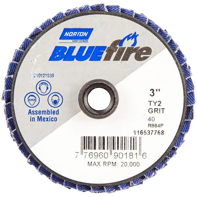This is manufactured by Norton. The manufacturer part number is 77696090181. Its diameter is 3.00" (76.20mm). It is shipped in bulk. It has a classic blue colour. While its abrasive grit is p40. Abrasive Grade Info: extra coarse. The product is widely employed in general purpose. It is manufactured from rugged zirconia alumina abrasive materials. The product is designated with the ear99 code number