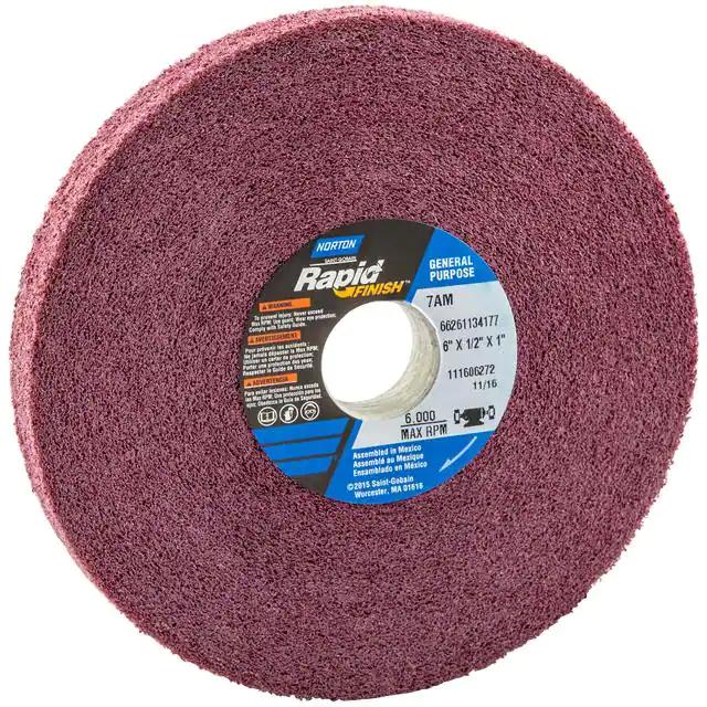 This is manufactured by Norton. The manufacturer part number is 66261134177. Its diameter is 6.00" (152.40mm). It is shipped in bulk. It has a classic maroon colour. Abrasive Grade Info: medium. Furthermore, the product is 0.50" (12.70mm) wide. The product is widely employed in general purpose. It is manufactured from rugged aluminum oxide abrasive materials. It comes in non-woven wheels configuration. The product is designated with the ear99 code number
