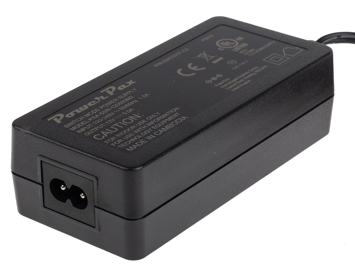 This is Desk Top Power Adapter C8 12Vdc 5A 60W manufactured by RS Pro. The manufacturer part number is 175-3286. Additionally, the product is supplied with 1 outputs. Load Regulation - ±5%. Furthermore, the product is 57mm wide. Input connector of iec 320-c8. Its accurate length is 125mm. It is a highly efficient product with an 89% of high efficiency. The product comes in 34.7mm depth. The adapter is a power brick adapter.