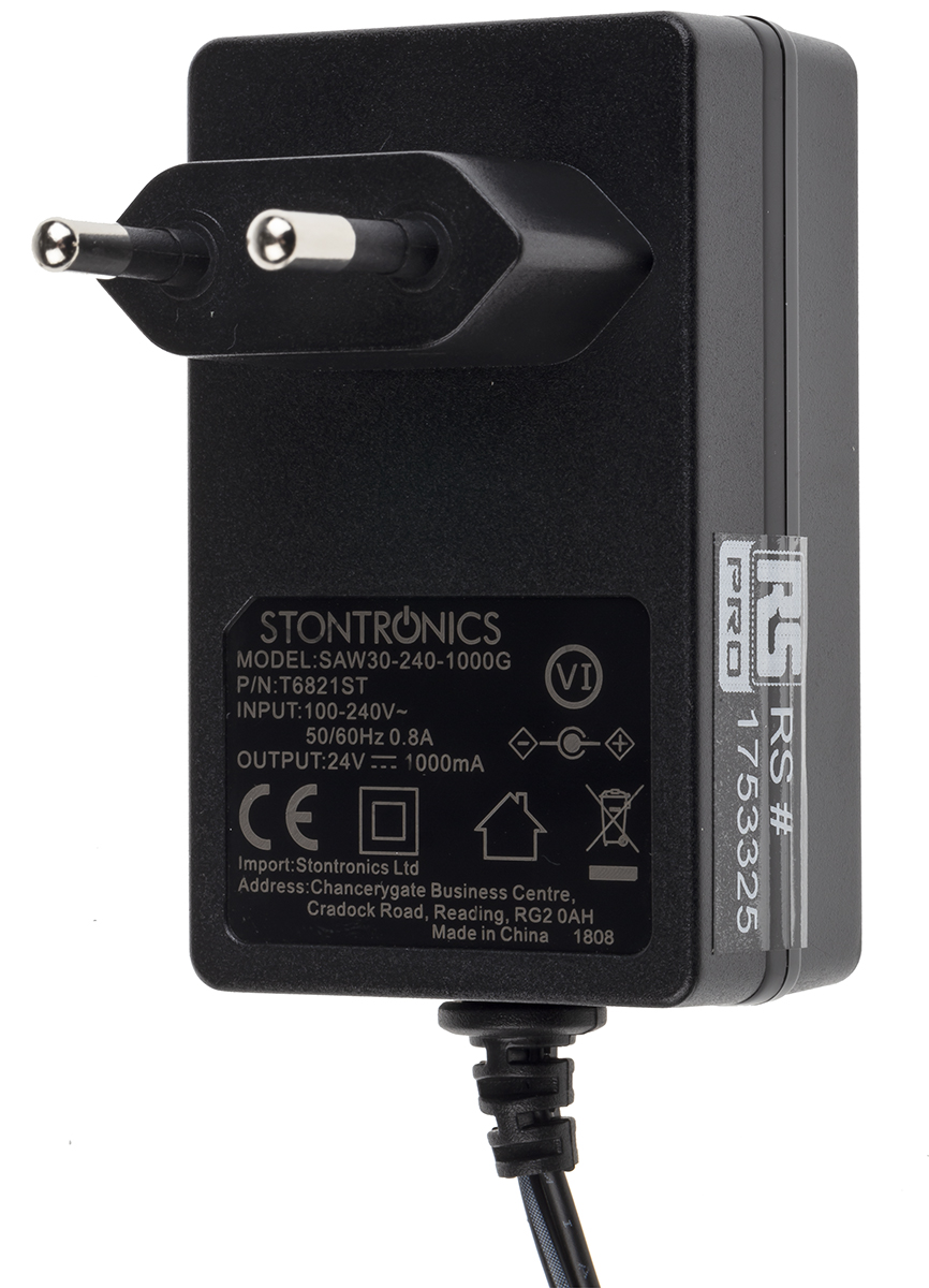 This is Power Adapter Euro Plug In 24V 24W manufactured by RS Pro. The manufacturer part number is 175-3325. Additionally, the product is supplied with 1 outputs. Load Regulation - ±2%. It is a highly efficient product with an (minimum) 86.8% of high efficiency. Input connector of eu plug. Its accurate length is 74.5mm. Features a versatile 2.1 x 5.5 x 12 mm centre positive output connector. Furthermore, the product is 50.4mm wide. The product comes in 88.7mm depth. The adapter is a plug-in adapter. It comes in ac/dc adapter configuration.
