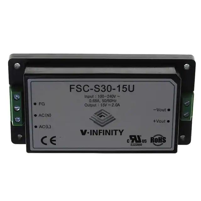 This is manufactured by CUI Inc.. The manufacturer part number is FSC-S30-15U. The product's diameters include 4.57" l x 2.31" w x 1.10" h (116.0mm x 58.7mm x 28.0mm). It features enclosed ac dc converters 1 output 15v 2a 85 ~ 264 vac input. 3kv of isolation voltage. The splendid features of the product include dc input capable, universal input. The product is available in chassis mount configuration. The product is widely employed in ite (commercial). The product fsc-s30 (30w), is a highly preferred choice for users. It has a 15v output voltage. Standard number include: 60950-1. In addition, box is the available packaging type of the product. It is a highly efficient product with an 83% of high efficiency. The product features power and watts of 30w. The maximum product's output current is 2a. It is approved by cb, ce. The possible product's input voltage is 85 ~ 264 vac. The product has -10°c ~ 60°c operating temperature range. It comes in enclosed configuration. Additionally, the product is supplied with 1 outputs. The cui inc.'s product offers user-desired applications.
