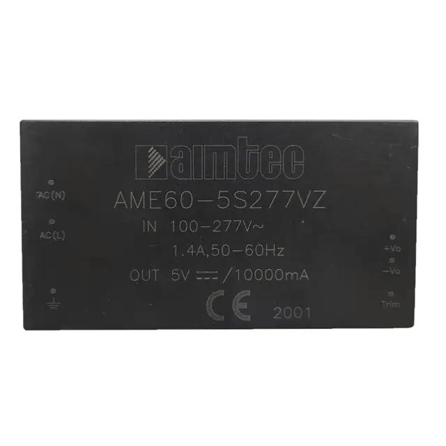 This is manufactured by aimtec. The manufacturer part number is AME60-48S277VZ. It is assigned with possible HTSUS value of 8504.40.9520. The product is rohs3 compliant. The product features power and watts of 60 w. The maximum product's output current is 1.25a. Moreover, the product comes in [Package/ Case]. The possible product's input voltage is 85 ~ 305 vac. The product is available in through hole configuration. It comes in enclosed configuration. Load Regulation - ±1%. The product is widely employed in ite (commercial). It has a 48v output voltage. It is a highly efficient product with an 86% of high efficiency. Has a line regulation of ±0.5%. It is shipped in bulk. The product's diameters include 4.29" l x 2.30" w x 1.18" h (109.0mm x 58.5mm x 30.0mm). Its typical moisture sensitivity level is 1 (unlimited). The typical product's weight is 0.661 lb (300.00 g). The product ame60-277vz (60w), is a highly preferred choice for users. The product has -40°c ~ 70°c (with derating) operating temperature range. Moreover, it corresponds to ame60, a base product number of the product. Additionally, the product is supplied with 1 outputs. The product is designated with the ear99 code number