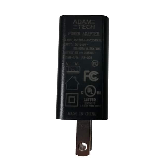 This is manufactured by Adam Tech. The manufacturer part number is PA-001. It is assigned with possible HTSUS value of 8504.40.9510. The product is rohs3 compliant. The product has 0°c ~ 40°c operating temperature range. The maximum product's output current is 2a. It is approved by culus, fcc. It carries fixed blade input type. The possible product's input voltage is 100 ~ 240 vac. The product is designed as a nice wall mount (class ii). It is a highly efficient product with an level vi of high efficiency. Input connector of nema 1-15p. In addition, it is reach unaffected. Features a versatile usb a receptacle output connector. The product is widely employed in ite (commercial). It is shipped in bag. The product is utilised in various regions, including north america. The product's diameters include 2.36" l x 1.38" w x 0.85" h (59.9mm x 35.0mm x 21.5mm). It has a long 10 weeks standard lead time. Its typical moisture sensitivity level is not applicable. Furthermore, the output voltage is 5v. The product is designated with the ear99 code number