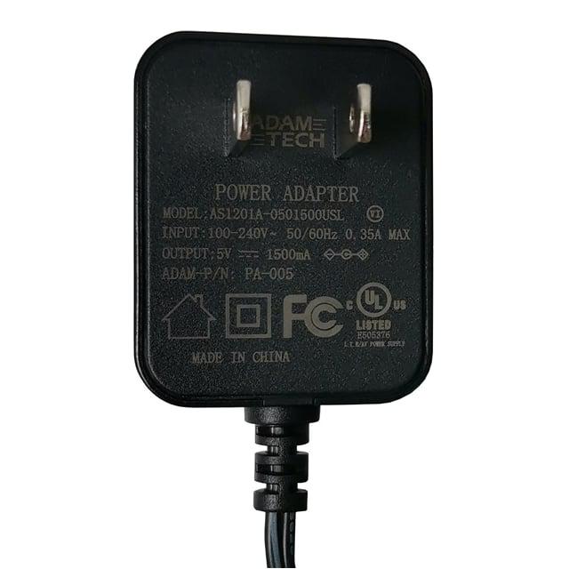 This is manufactured by Adam Tech. The manufacturer part number is PA-005. It is assigned with possible HTSUS value of 8504.40.9510. The product is rohs3 compliant. The product has 0°c ~ 40°c operating temperature range. The maximum product's output current is 1.5a. It is approved by culus, fcc. It carries fixed blade input type. The possible product's input voltage is 100 ~ 240 vac. The product is designed as a nice wall mount (class ii). It is a highly efficient product with an level vi of high efficiency. Input connector of nema 1-15p. In addition, it is reach unaffected. Features a versatile barrel plug, 2.5mm i.d. x 5.5mm o.d. x 9.5mm output connector. The product is widely employed in ite (commercial). It is shipped in bag. The product is utilised in various regions, including north america. The product's diameters include 1.73" l x 1.40" w x 0.98" h (44.0mm x 35.6mm x 25.0mm). The cord is 59" (1.50m) long. It has a long 10 weeks standard lead time. Its typical moisture sensitivity level is not applicable. Furthermore, the output voltage is 5v. The product is designated with the ear99 code number