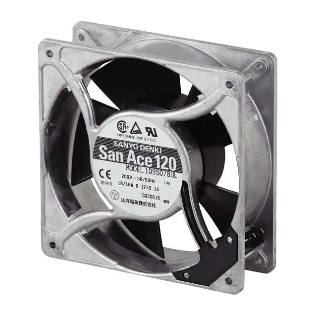 This is manufactured by Sanyo Denki America Inc.. The manufacturer part number is 109S078UL. The blades are constructed from robust plastic materials. It is assigned with possible HTSUS value of 8414.59.6590. The product is rohs3 compliant. Furthermore, the product is 38.00mm wide. The product features power and watts of 16.00w. It has a 102.5 cfm (2.87m³/min) air flow rate. It is approved by ce, csa, pse, tuv, ul. It has noise values of 45.0db(a). It also exhibits voltage rating of 200vac. This has integrated with a ball, a bearing with long-lasting features. The product has -22 ~ 140°f (-30 ~ 60°c) operating temperature range. It provides maximum rpm up to 3100 rpm. This product offers longer life span for 25000 hrs @ 60°c. The product has a 0.276 in h2o (68.7 pa) static pressure. It is shipped in box. The product's diameters include square - 119mm l x 119mm h. The product features 2 terminals termination style. It has a long 55 weeks standard lead time. Additionally, the product's output is 0.140a Its typical moisture sensitivity level is not applicable. The typical product's weight is 1.2 lbs (544.3 g). The product san ace 120, is a highly preferred choice for users. The frame of the product is made from highly durable aluminum materials. The latest designed fan is a type of tubeaxial offering unmatchable applications. Moreover, it corresponds to 109s078, a base product number of the product. The product is designated with the ear99 code number