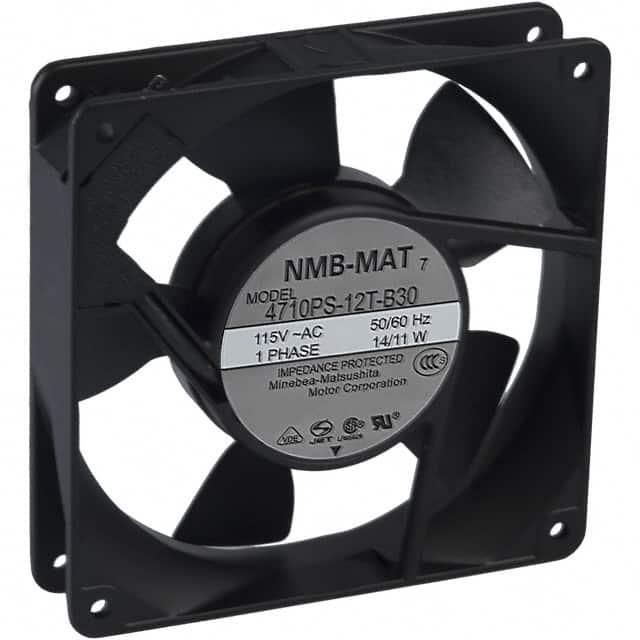This is manufactured by NMB Technologies Corporation. The manufacturer part number is 4710PS-12T-B30-A00. The blades are constructed from robust polycarbonate (pc), fiberglass reinforced materials. It is assigned with possible HTSUS value of 8414.59.6590. The product is rohs compliant. Furthermore, the product is 25.50mm wide. The product features power and watts of 11.00w. It has a 70.6 cfm (1.98m³/min) air flow rate. It is approved by ce, csa, ul, vde. It has noise values of 38.0db. It also exhibits voltage rating of 115vac. This has integrated with a ball, a bearing with long-lasting features. The product has 14 ~ 158°f (-10 ~ 70°c) operating temperature range. It provides maximum rpm up to 2700 rpm. This product offers longer life span for 50000 hrs @ 25°c. The product has a 0.160 in h2o (39.8 pa) static pressure. It is shipped in bulk. The product's diameters include square - 119mm l x 119mm h. The product features 2 terminals termination style. Additionally, the product's output is 0.160a Its typical moisture sensitivity level is 1 (unlimited). The typical product's weight is 0.8 lb (362.87 g). The product ps, is a highly preferred choice for users. The frame of the product is made from highly durable aluminum materials. The latest designed fan is a type of tubeaxial offering unmatchable applications. Moreover, it corresponds to 4710ps, a base product number of the product. The product is designated with the ear99 code number
