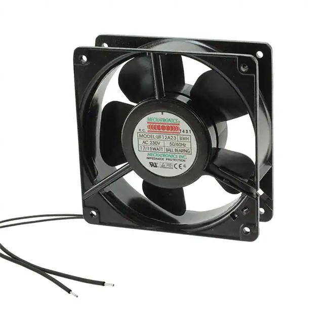 This is manufactured by Mechatronics Fan Group. The manufacturer part number is UF12A23-BWHR. The blades are constructed from robust polybutylene terephthalate (pbt) materials. It is assigned with possible HTSUS value of 8414.59.6590. The product is rohs compliant. Furthermore, the product is 38.00mm wide. The product features power and watts of 15.00w. It has a 106.0 cfm (2.97m³/min) air flow rate. It is approved by ce, cul, tuv, ul. It has noise values of 46.0db(a). It also exhibits voltage rating of 230vac. This has integrated with a ball, a bearing with long-lasting features. The product has -40 ~ 158°f (-40 ~ 70°c) operating temperature range. It provides maximum rpm up to 3100 rpm. This product offers longer life span for 50000 hrs @ 25°c. The product has a 0.350 in h2o (87.2 pa) static pressure. It is shipped in bulk. The product's diameters include square - 120mm l x 120mm h. The product features 2 wire leads termination style. It has a long 44 weeks standard lead time. Additionally, the product's output is 0.080a Its typical moisture sensitivity level is 1 (unlimited). The typical product's weight is 1.2 lbs (544.3 g). The product uf12a, is a highly preferred choice for users. The frame of the product is made from highly durable aluminum materials. The latest designed fan is a type of tubeaxial offering unmatchable applications. Moreover, it corresponds to uf12a, a base product number of the product. The product is designated with the ear99 code number