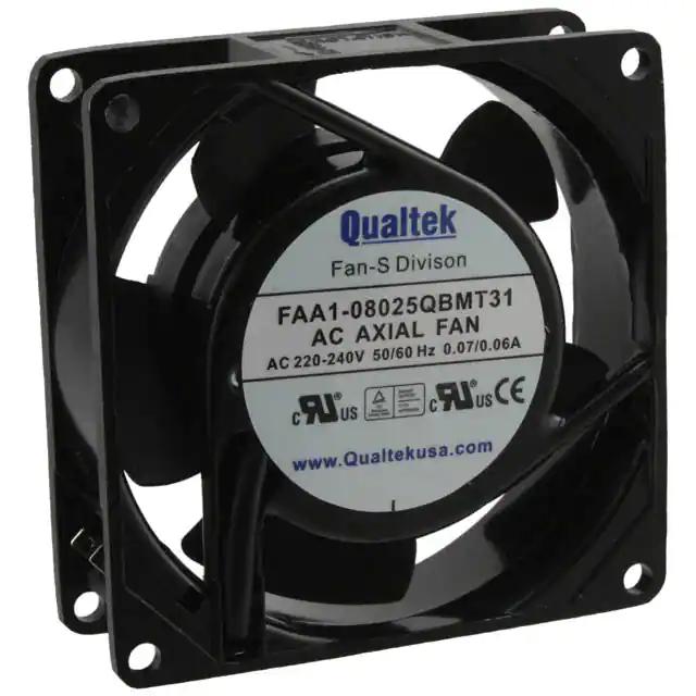 This is manufactured by Qualtek. The manufacturer part number is FAA1-08025QBMT31. The blades are constructed from robust plastic materials. It is assigned with possible HTSUS value of 8414.59.6590. The product is rohs3 compliant. Furthermore, the product is 25.00mm wide. The product features power and watts of 11.00w. It has a 19.0 cfm (0.532m³/min) air flow rate. It is approved by ce, curus, tuv. It has noise values of 24.0db(a). It also exhibits voltage rating of 230vac. In addition, it is reach unaffected. This has integrated with a ball, a bearing with long-lasting features. The product has 14 ~ 158°f (-10 ~ 70°c) operating temperature range. It provides maximum rpm up to 2500 rpm. The product has a 0.118 in h2o (29.4 pa) static pressure. It is shipped in bulk. The product's diameters include square - 80mm l x 80mm h. The product features 2 terminals termination style. It has a long 38 weeks standard lead time. Additionally, the product's output is 0.055a Its typical moisture sensitivity level is 1 (unlimited). The typical product's weight is 0.463 lb (210.01 g). The product faa1-08025, is a highly preferred choice for users. The frame of the product is made from highly durable aluminum materials. The latest designed fan is a type of tubeaxial offering unmatchable applications. Moreover, it corresponds to faa1-08025, a base product number of the product. The product is designated with the ear99 code number