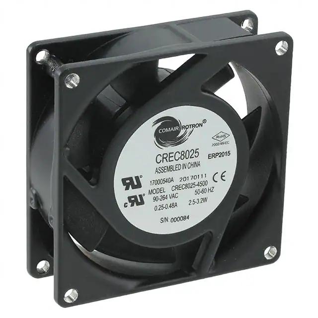 This is manufactured by Comair Rotron. The manufacturer part number is 17000540A. The blades are constructed from robust polybutylene terephthalate (pbt), fiberglass reinforced materials. It is assigned with possible HTSUS value of 8414.59.6590. The product is rohs3 compliant. Furthermore, the product is 25.00mm wide. The product features power and watts of 4.00w. It has a 32.0 cfm (0.896m³/min) air flow rate. It is approved by ce, cul, ul. While the voltage range is 90 ~ 264vac. It has noise values of 45.0db(a). It also exhibits voltage rating of 100 ~ 240vac. In addition, it is reach unaffected. This has integrated with a ball, a bearing with long-lasting features. The product has -4 ~ 158°f (-20 ~ 70°c) operating temperature range. It provides maximum rpm up to 4500 rpm. This product offers longer life span for varies based on temperature. The product has a 0.360 in h2o (89.6 pa) static pressure. It is shipped in box. The product's diameters include square - 80mm l x 80mm h. The product features 2 terminals termination style. It has a long 26 weeks standard lead time. Additionally, the product's output is 0.480a Its typical moisture sensitivity level is not applicable. The splendid features of the product include auto restart, electronic commutation (ec). The typical product's weight is 0.386 lb (175.09 g). The frame of the product is made from highly durable magnesium alloy materials. The latest designed fan is a type of tubeaxial offering unmatchable applications. The product is designated with the ear99 code number