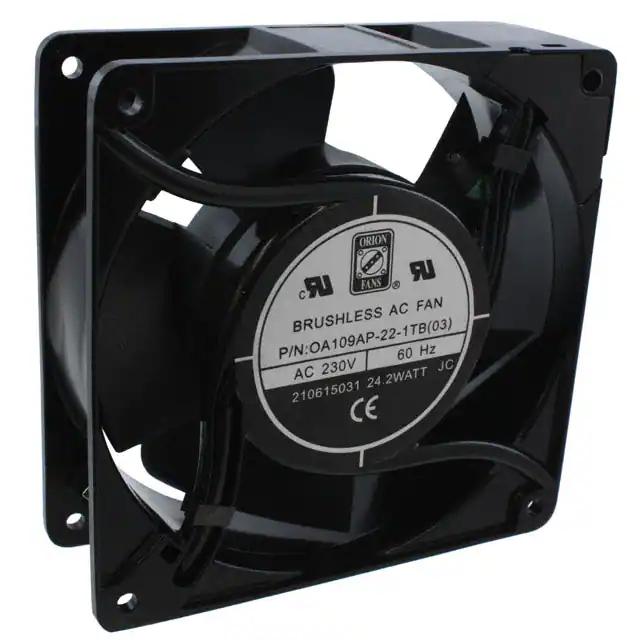 This is manufactured by Orion Fans. The manufacturer part number is OA109AP-22-1TB03. The blades are constructed from robust polybutylene terephthalate (pbt) materials. It is assigned with possible HTSUS value of 8414.59.6590. The product is rohs3 compliant. Furthermore, the product is 38.50mm wide. The product features power and watts of 8.00w. It has a 63.0 cfm (1.76m³/min) air flow rate. It is approved by curus. It has noise values of 37.0db. It also exhibits voltage rating of 230vac. In addition, it is reach unaffected. This has integrated with a ball, a bearing with long-lasting features. The product has 14 ~ 158°f (-10 ~ 70°c) operating temperature range. It provides maximum rpm up to 1600 rpm. This product offers longer life span for 60000 hrs @ 40°c. It is shipped in box. The product's diameters include square - 119.5mm l x 119.5mm h. The product features 2 terminals termination style. It has a long 19 weeks standard lead time. Additionally, the product's output is 0.070a Its typical moisture sensitivity level is 1 (unlimited). The splendid features of the product include temperature sensor. The product oa109, is a highly preferred choice for users. The frame of the product is made from highly durable aluminum materials. The latest designed fan is a type of tubeaxial offering unmatchable applications. Moreover, it corresponds to oa109ap, a base product number of the product. The product is designated with the ear99 code number