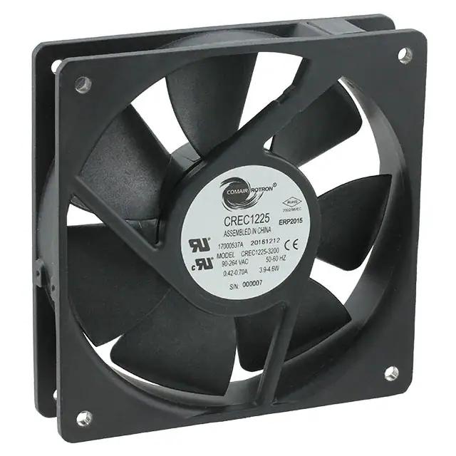 This is manufactured by Comair Rotron. The manufacturer part number is 17000537A. The blades are constructed from robust polybutylene terephthalate (pbt), fiberglass reinforced materials. It is assigned with possible HTSUS value of 8414.59.6590. The product is rohs3 compliant. Furthermore, the product is 25.00mm wide. The product features power and watts of 5.50w. It has a 92.0 cfm (2.58m³/min) air flow rate. It is approved by ce, cul, ul. While the voltage range is 90 ~ 264vac. It has noise values of 47.0db(a). It also exhibits voltage rating of 100 ~ 240vac. In addition, it is reach unaffected. This has integrated with a ball, a bearing with long-lasting features. The product has -4 ~ 158°f (-20 ~ 70°c) operating temperature range. It provides maximum rpm up to 3200 rpm. This product offers longer life span for varies based on temperature. The product has a 0.300 in h2o (74.7 pa) static pressure. It is shipped in box. The product's diameters include square - 120mm l x 120mm h. The product features 2 terminals termination style. It has a long 26 weeks standard lead time. Additionally, the product's output is 0.700a Its typical moisture sensitivity level is not applicable. The splendid features of the product include auto restart, electronic commutation (ec). The typical product's weight is 0.498 lb (225.89 g). The frame of the product is made from highly durable magnesium alloy materials. The latest designed fan is a type of tubeaxial offering unmatchable applications. The product is designated with the ear99 code number