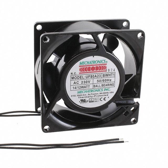 This is manufactured by Mechatronics Fan Group. The manufacturer part number is UF80A23-BWHR-T1. The blades are constructed from robust polybutylene terephthalate (pbt) materials. It is assigned with possible HTSUS value of 8414.59.6590. The product is rohs compliant. Furthermore, the product is 38.00mm wide. The product features power and watts of 12.00w. It has a 30.0 cfm (0.840m³/min) air flow rate. It is approved by ce, cul, tuv, ul. It has noise values of 36.0db(a). It also exhibits voltage rating of 230vac. This has integrated with a ball, a bearing with long-lasting features. The product has -40 ~ 158°f (-40 ~ 70°c) operating temperature range. It provides maximum rpm up to 3000 rpm. The product has a 0.220 in h2o (54.8 pa) static pressure. It is shipped in bulk. The product's diameters include square - 80mm l x 80mm h. The product features 2 wire leads termination style. It has a long 12 weeks standard lead time. Additionally, the product's output is 0.060a Its typical moisture sensitivity level is not applicable. The splendid features of the product include thermal overload protector (top). The typical product's weight is 0.617 lbs (280.00 g). The product uf80a, is a highly preferred choice for users. The frame of the product is made from highly durable polybutylene terephthalate (pbt) materials. The latest designed fan is a type of tubeaxial offering unmatchable applications. Moreover, it corresponds to uf80a, a base product number of the product. The product is designated with the ear99 code number