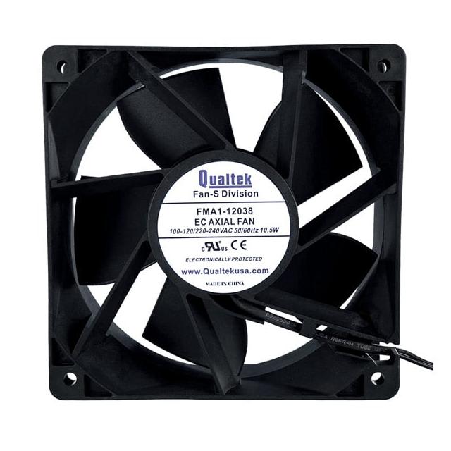 This is manufactured by Qualtek. The manufacturer part number is FMA1-12038WBJW12-A. The blades are constructed from robust plastic materials. It is assigned with possible HTSUS value of 8414.59.6590. The product is rohs3 compliant. Furthermore, the product is 38.00mm wide. The product features power and watts of 15.00w. It has a 137.6 cfm (3.85m³/min) air flow rate. It is approved by ce, curus. It has noise values of 51.5db(a). It also exhibits voltage rating of 100 ~ 240vac. In addition, it is reach unaffected. This has integrated with a ball, a bearing with long-lasting features. The product has -4 ~ 158°f (-20 ~ 70°c) operating temperature range. It provides maximum rpm up to 3500 rpm. This product offers longer life span for 70000 hrs @ 40°c. The product has a 0.445 in h2o (110.8 pa) static pressure. It is shipped in bulk. The product's diameters include square - 120mm l x 120mm h. The product features 2 wire leads termination style. It has a long 15 weeks standard lead time. Additionally, the product's output is 0.180a Its typical moisture sensitivity level is 1 (unlimited). It is IP rated with ip54 - dust protected, water resistant. The splendid features of the product include electronic commutation (ec). The product fma1-12038-a, is a highly preferred choice for users. The frame of the product is made from highly durable plastic materials. The latest designed fan is a type of tubeaxial offering unmatchable applications. Moreover, it corresponds to fma1-12038, a base product number of the product. The product is designated with the ear99 code number