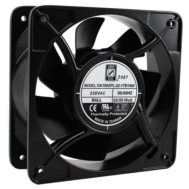 This is manufactured by Orion Fans. The manufacturer part number is OA180APL-22-1TB1868. The blades are constructed from robust steel materials. It is assigned with possible HTSUS value of 8414.59.6590. The product is rohs3 compliant. Furthermore, the product is 65.00mm wide. The product features power and watts of 80.0w. It has a 400.0 cfm (11.20m³/min) air flow rate. It is approved by ce, curus, tuv, ur. It has noise values of 65.0db. It also exhibits voltage rating of 230vac. In addition, it is reach unaffected. This has integrated with a ball, a bearing with long-lasting features. The product has -22 ~ 176°f (-30 ~ 80°c) operating temperature range. It provides maximum rpm up to 3250 rpm. This product offers longer life span for 50000 hrs @ 55°c. The product has a 0.800 in h2o (199.3 pa) static pressure. It is shipped in box. The product's diameters include square - 180mm l x 180mm h. The product features 2 terminals termination style. It has a long 19 weeks standard lead time. Its typical moisture sensitivity level is not applicable. It is IP rated with ip68 - dust tight, waterproof. The splendid features of the product include thermal overload protector (top). The typical product's weight is 4 lbs (1.8 kg). The product oa180apl, is a highly preferred choice for users. The frame of the product is made from highly durable aluminum materials. The latest designed fan is a type of tubeaxial offering unmatchable applications. Moreover, it corresponds to oa180ap, a base product number of the product. The product is designated with the ear99 code number